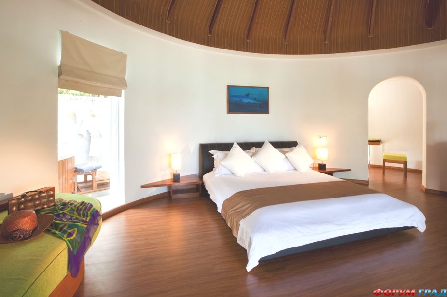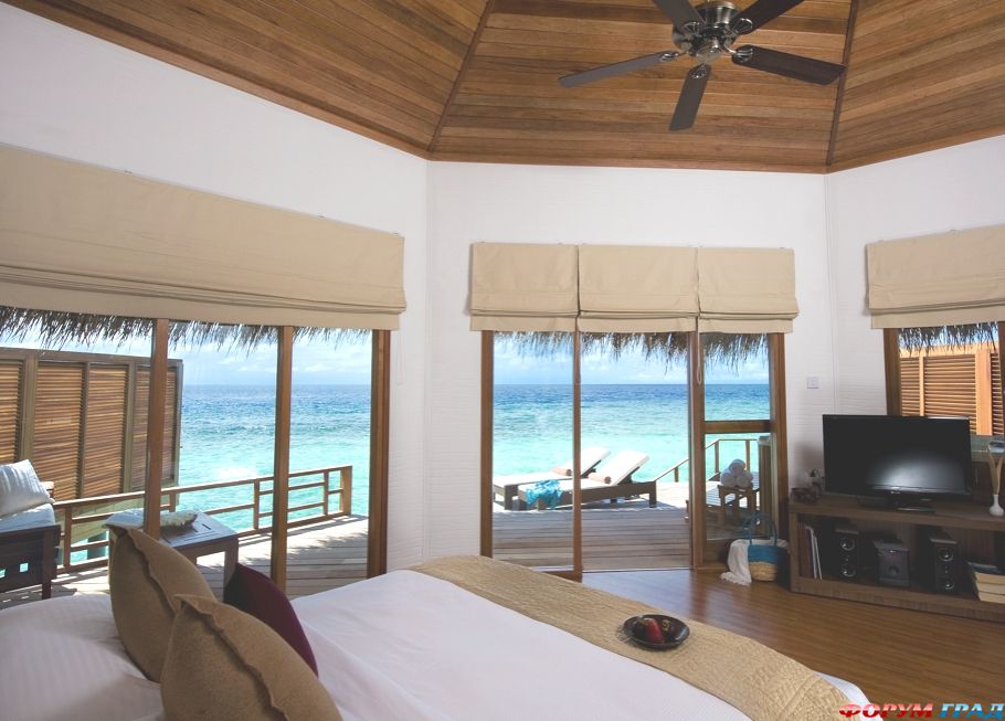 3. Отдельно стоящие виллы, со стороны лагуны разбросаны по всему острову, невдалеке от пляжа. Ванная комната частично расположена на открытом воздухе: фен, ливневый душ, халаты, банные принадлежности. В номере имеется мини-бар, сейф, кондиционер, вентилятор, телефон, ТВ, чайные принадлежности, iPod станция и DVD плеер. Около входа стоят удобные шезлонги.