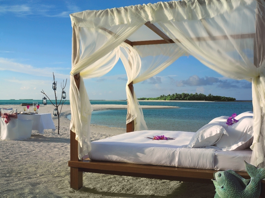 Beach Villas разбросаны по всей длине по обеим сторонам, имеют выходы на пляжи, покрытые мелким белым песком, и к лазурному морю. К ним ведут приподнятые деревянные пути, которые простираются за пределы центра восточного берега, разделяясь на две пешеходные линии в лагуне – Water Villas и Grand Water Villas. В конце путей установлены отдельные веранды с деревянными ступенями, которые направлены прямо в воду.
