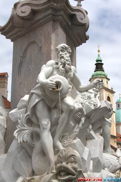 Напротив Ратуши невозможно не заметить прекрасный фонтан Франческо Роббы, который назван "Реки Карниолии", где каждой из рек (Крка, Савва и Любляница) досталась собственная аллегорическая фигура.