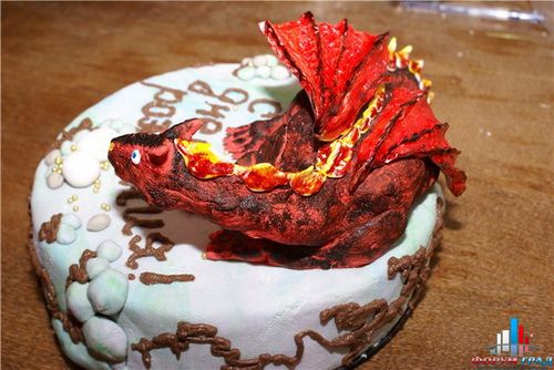 На тортик с драконом у меня совсем не было времени. Город у нас небольшой, и обежав все магазины, ни в одном не нашла мармышек. Через инет заказывать мастику уже не было времени. Поэтому делала его из желатиновой мастики. Не рассчитала, что она так быстро застынет, Дракон-то довольно большой был. Поэтому мне не удалось как следует его разгладить и шкурка получилась бугристая. Я саму мастику еще на начальной стадии выкрасила в красный а потом губкой наносила коричневый. В складочки краска не попала, поэтому у него такой окрас.