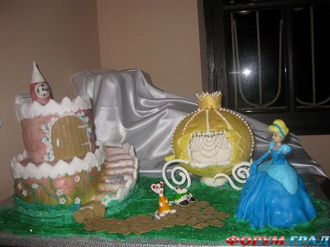 иннес, прикольный тортик, вот никак не могу понять из чего сделана кукла, это мастичная или настоящая? Замок мне кажется немного наклонился, или это фотка такая? А еще я не совсем поняла куда пропали колеса у кареты? Или это уже превращение после 12 праздника в реальность?