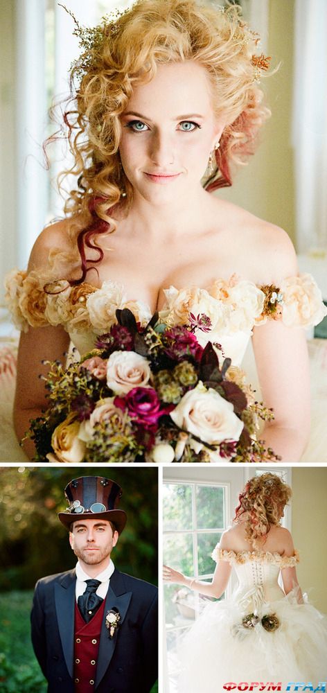 Наряд невесты, на такой фантастической свадьбе, не обойдётся без традиционного платья с корсетом, только изящные туфельки заменят сапоги с высоким голенищем, а причёску дополнит миниатюрная шляпка с вуалью. Украшениями будут стилизованная бижутерия в виде механизмов часов или их деталей.