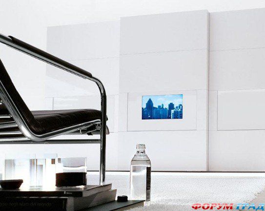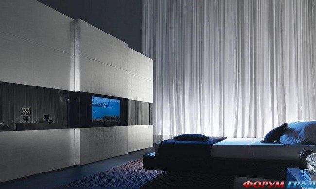 Отлично экономит место и совершенно не портит общий интерьер телевизионная панель, убирающаяся в нишу потолка или изножье кровати. В нужный момент техника всегда находится в необходимой близости, а в остальное время ничем о себе не напоминает. Но следует отметить, что эти технологии могут позволить себе далеко не все, делаются они обычно на заказ и стоят совсем не дешево.